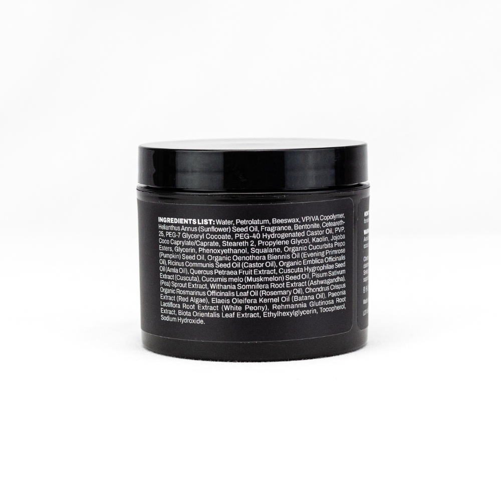 Water, Petrolatum, Beeswax, VP/VA Copolymer, Helianthus Annus (Sunflower) Seed Oil, Fragrance, Bentonite, Ceteareth-25, PEG-7 Glyceryl Cocoate, PEG-40 Hydrogenated Castor Oil, PVP, Coco Caprylate/Caprate, Steareth 2, Propylene Glycol, Kaolin, Jojoba Esters, Glycerin, Phenoxyethanol, Squalane, Organic Cucurbita Pepo (Pumpkin) Seed Oil, Organic Oenothera Biennis Oil (Evening Primrose Oil), Ricinus Communis Seed Oil (Castor Oil), Organic Emblica Officinalis Oil (Amla Oil), Quercus Petraea Fruit Extract, Cuscuta Hygrophilae Seed Extract (Cuscuta), Cucumis melo (Muskmelon) Seed Oil, Pisum Sativum (Pea) Sprout Extract, Withania Somnifera Root Extract (Ashwagandha), Organic Rosmarinus Officinalis Leaf Oil (Rosemary Oil), Chondrus Crispus Extract (Red Algae), Elaeis Oleifera Kernel Oil (Batana Oil), Paeonia Lactiflora Root Extract (White Peony), Rehmannia Glutinosa Root Extract, Biota Orientalis Leaf Extract, Ethylhexylglycerin, Tocopherol, Sodium Hydroxide.